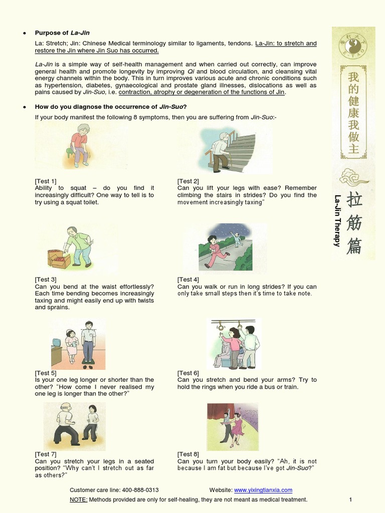 Jin-Suo (tendon stiffness and contraction) may seem to only affect bodily movements; in actual fact, it negatively impacts all internal organs. Our bones, limbs, and internal organs are linked together by tendons, ligaments, and meridians. And the 12 main tendons run alongside the 12 main meridians. Jin-Suo causes meridian blockages and health problems. And it does not occur in certain parts of the body, but in the entire body and throughout a person’s life. Jin-Suo is related to all illnesses; Lajin helps to heal pains and diseases.
